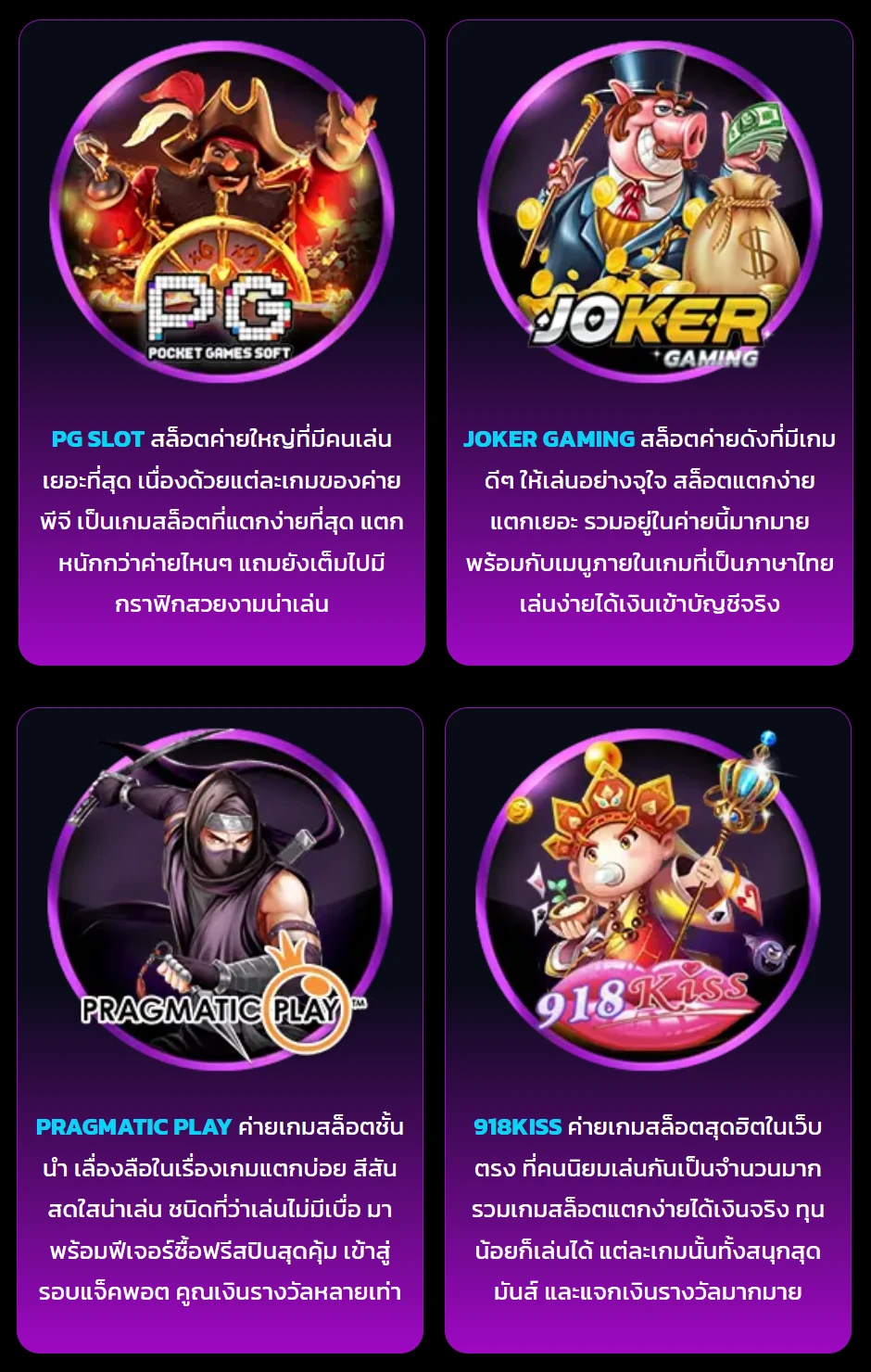ตอบโจทย์แก่ผู้เล่นทุกท่าน ที่ต้องการเล่นเกมส์หลายค่าย ทาง สล็อตเว็บตรงไม่ผ่านเอเย่นต์ 2024 ของเรา ได้รวบรวมสล็อตค่ายใหญ่ มาให้เล่นทั้งหมดแล้ว และที่สำคัญล้วนแต่เป็น เกมสล็อตแตกง่ายทั้งสิ้น ไม่ว่าจะเล่นเกมไหนจากค่ายไหน ก็เตรียมลุ้นเงินรางวัลก้อนโตกันได้เลย แต่ก่อนที่จะไปเริ่มเล่นค่ายเกมสล็อตเว็บตรง ไปดูกันก่อนว่ามีค่ายอะไรที่น่าสนใจบ้าง